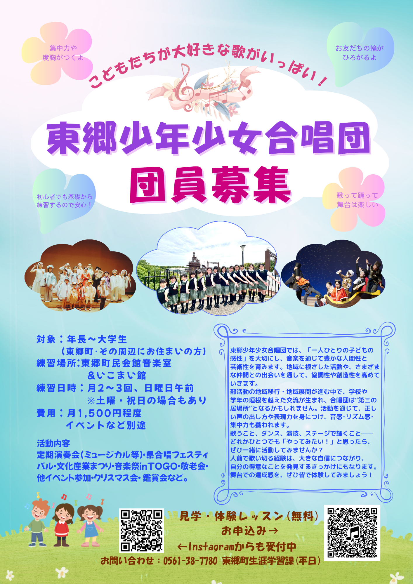 東郷町少年少女合唱団はオペレッタを中心にミュージカル曲やさまざまな楽曲を練習し、愛知県少年少女合唱団連盟フェスティバルや音楽祭inTOGO合唱の部に毎年参加しています。 ※体験・見学なども連絡してくださいね