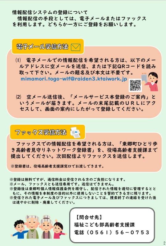ファックスでの配信を希望される方は、東郷町ひとり歩き高齢者見守りネットワーク登録書を高齢者支援課に提出してください。