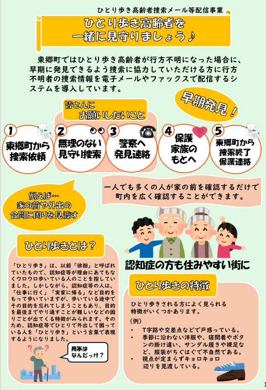 東郷町では、認知症のある人がひとり歩きにより行方不明になった場合に、早期に発見できるよう捜索に協力していただける方に、行方不明者の情報を電子メールやファックスで配信するシステムを導入しています。