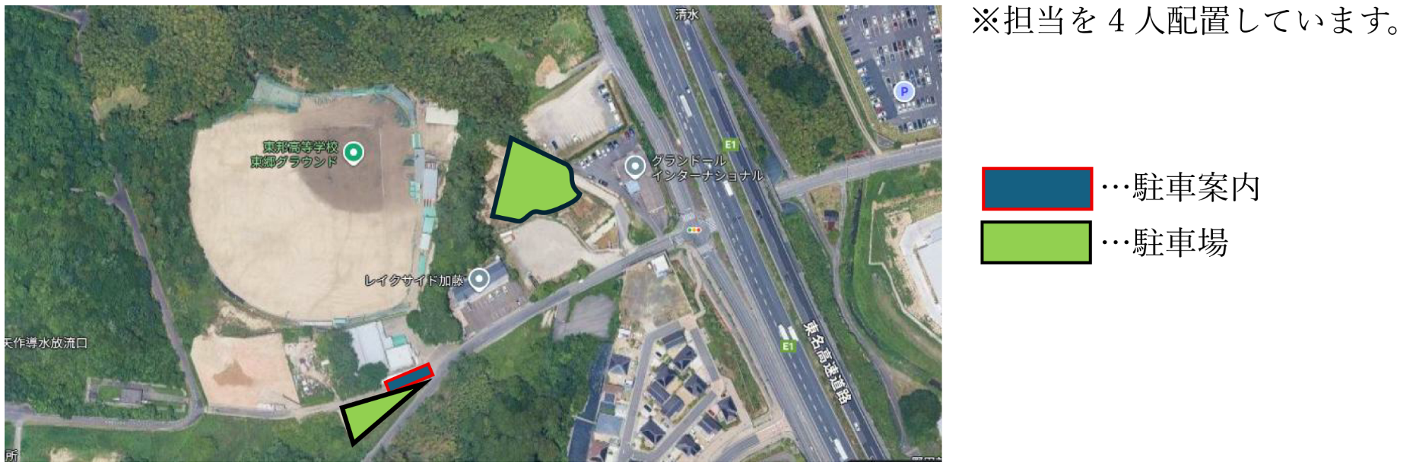 まずは球場横の側道に入って駐車案内にて担当より指示を受けてください。